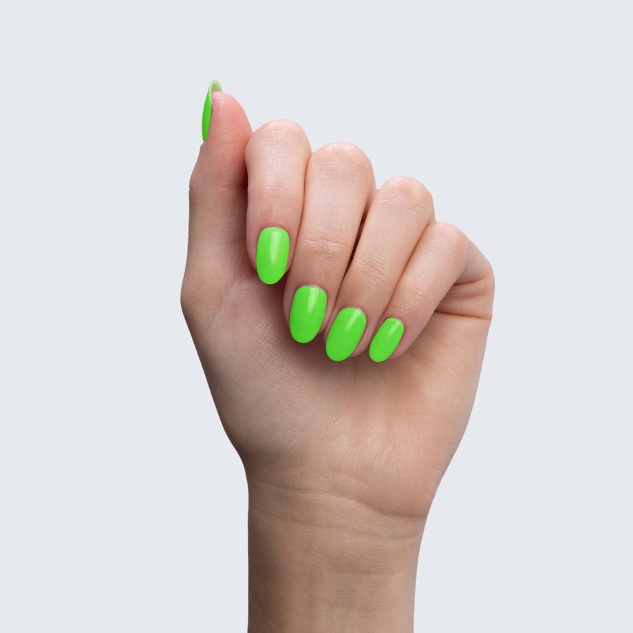 Neon green. Bright. Cool undertone. Medium opacity (slightly translucent).